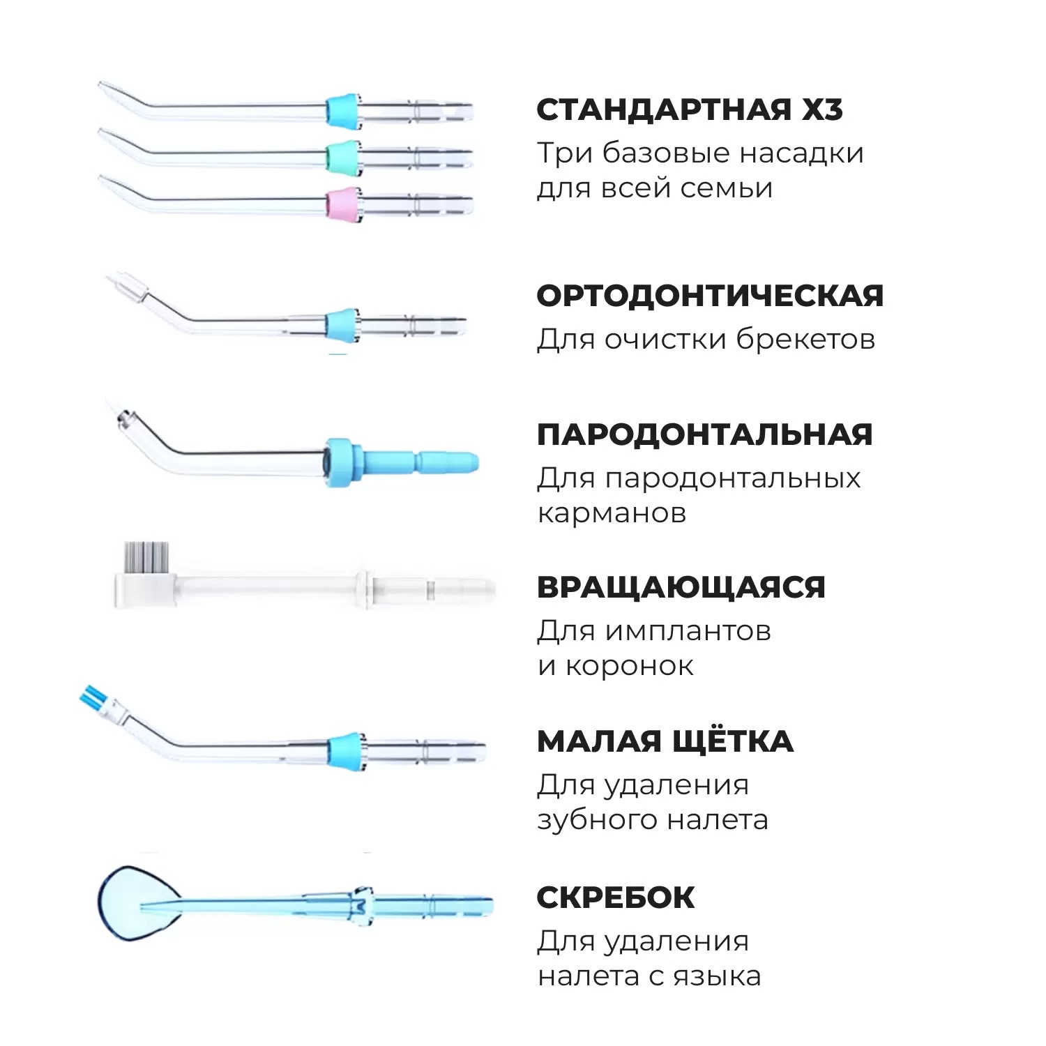 Когда ты покупаешь ирригатор, обычно в комплекте идёт одна или несколько насадок. И вот тут важный момент — каждая насадка предназначена для разных целей, и что немаловажно, у каждого члена семьи должна быть своя. Насадки можно менять и докупать, так что не переживай, если тебе нужно больше опций.