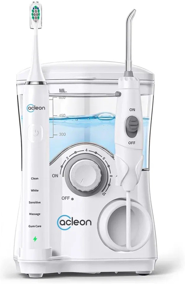 Самая дорогая модель в нашей подборке, но не спешите пролистывать! Acleon TF800 – это устройство «2 в 1», и помимо ирригатора с 11 насадками в комплект входит еще и электрическая зубная щетка с деликатными, но беспощадными к грязи щетинками. Ежедневное применение зубного центра обеспечит удаление 99% зубного налета. Прибор может работать на 10 режимах давления струи, так что вы и ваши члены семьи сможете найти для себя оптимальный. Автономная работа без дополнительной зарядки возможна на протяжении 21 суток. А еще у зубного центра емкость почти в два раза больше, чем у предыдущих «кандидатов» на роль вашего «домашнего стоматолога» - 600 мл!