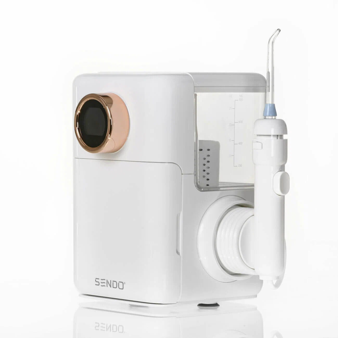 Лучший ирригатор для полости рта в нашем топе! Стационарный аппарат подойдет для домашнего использования. Самый большой резервуар – емкость достигает 900 мл., хватит на несколько использований! В устройство встроен аэратор, позволяющий насыщать жидкость внутри ирригатора кислородом. Тем самым, устройство позволит обеспечивать свежее и приятное дыхание, а также бережно относиться к деснам. Наконец, Sendo PulseBrush v900 оснащен специальным шкафчиком с ультрафиолетовым дезинфицирующим светодиодом, в которой удобно хранить и очищать насадки. А заряда хватит на 14 дней без дополнительной подпитки.