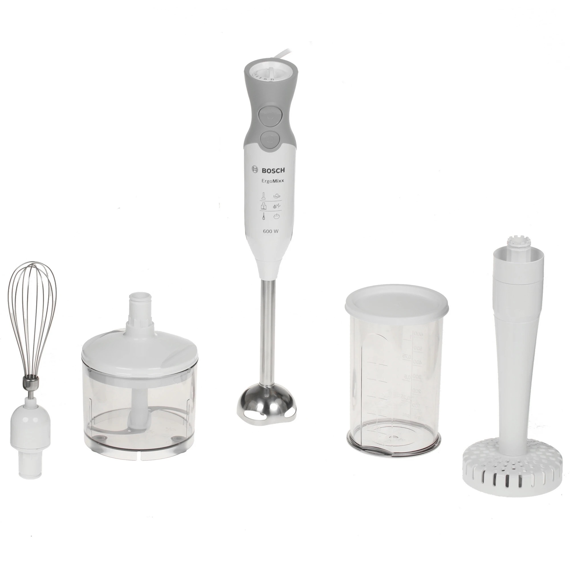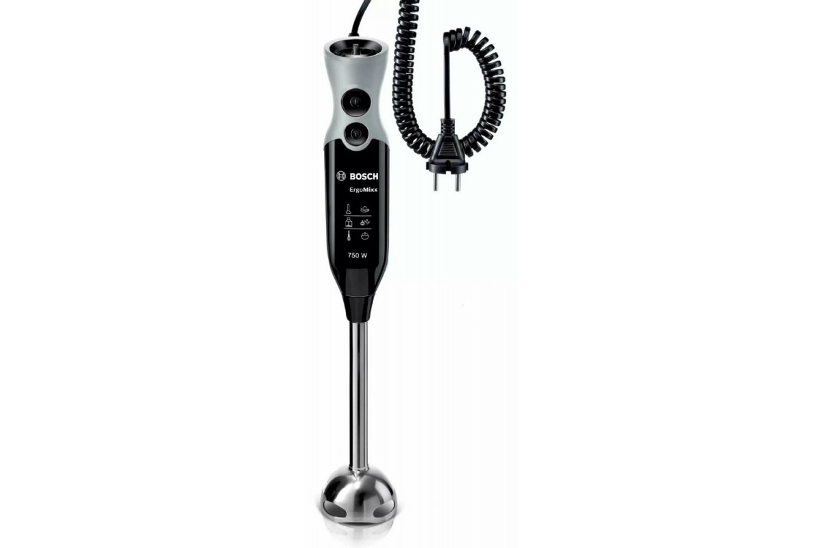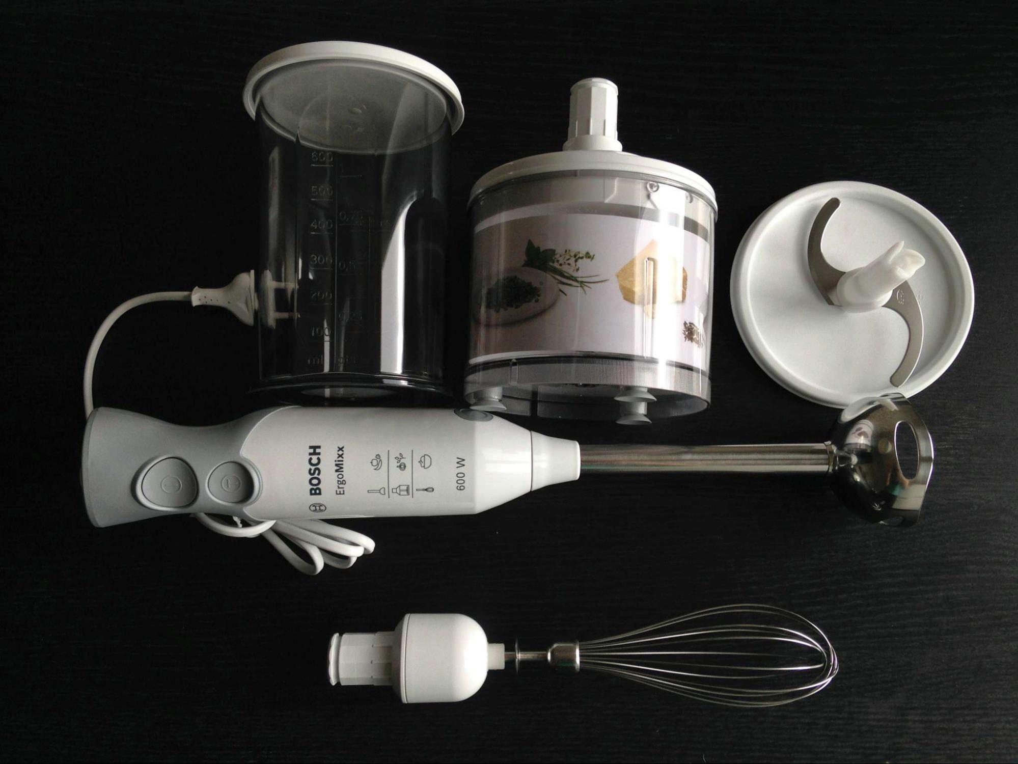 - Bosch MSM66110 (600W) – простой погружной блендер с 600 Вт и одной скоростью. Имеет насадку-измельчитель и венчик, лёгок и недорог, хорошо подойдёт для повседневных супов и смузи. (Цена ≈ 2 000 руб.)