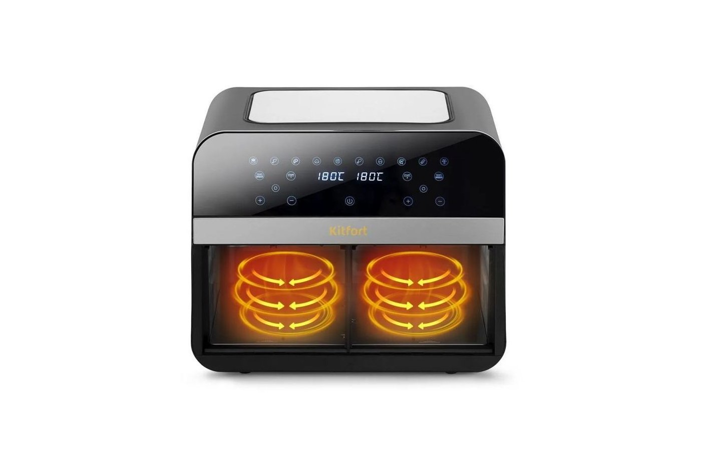 Характеристики: 2700 Вт, общ. объём 8,6 л (две по 4,3), 8 программ, 80–200 °C, таймер 60 мин, сенсорное управление.