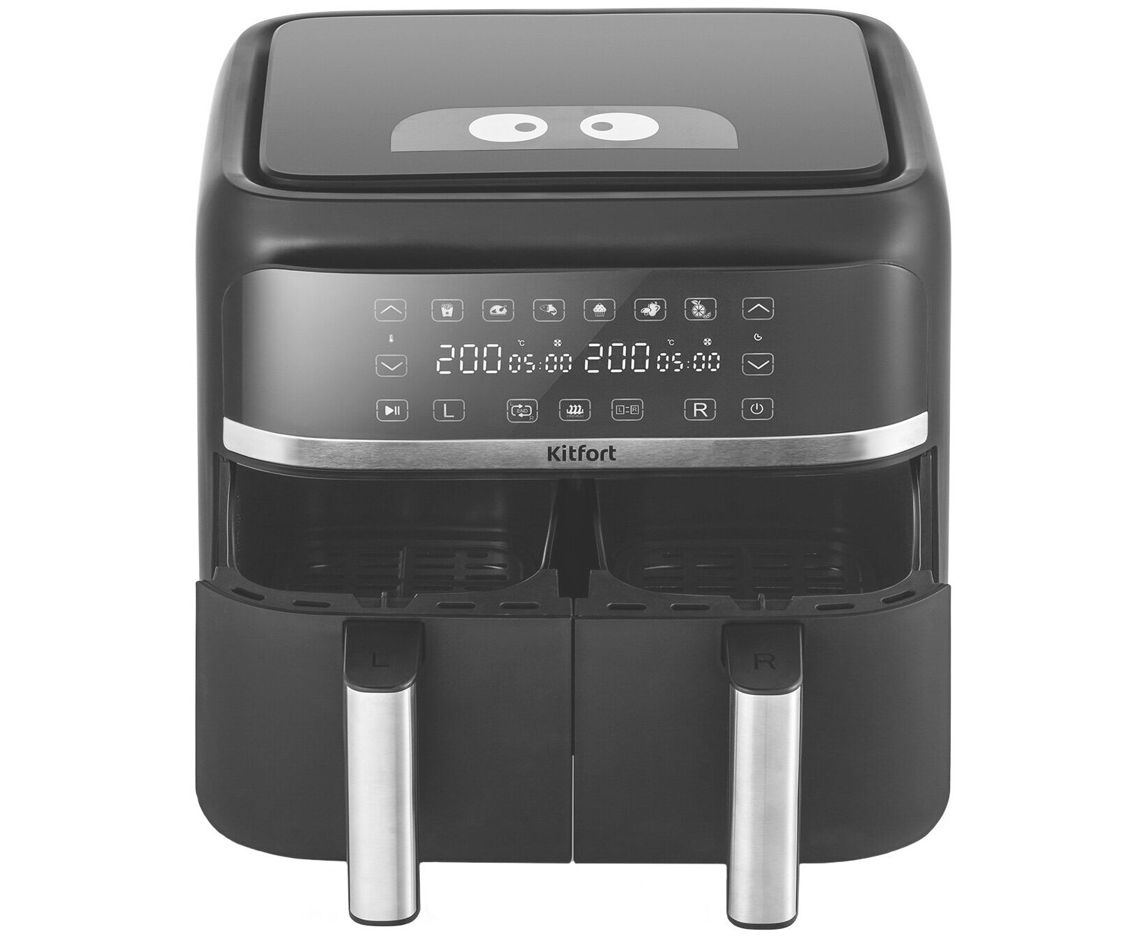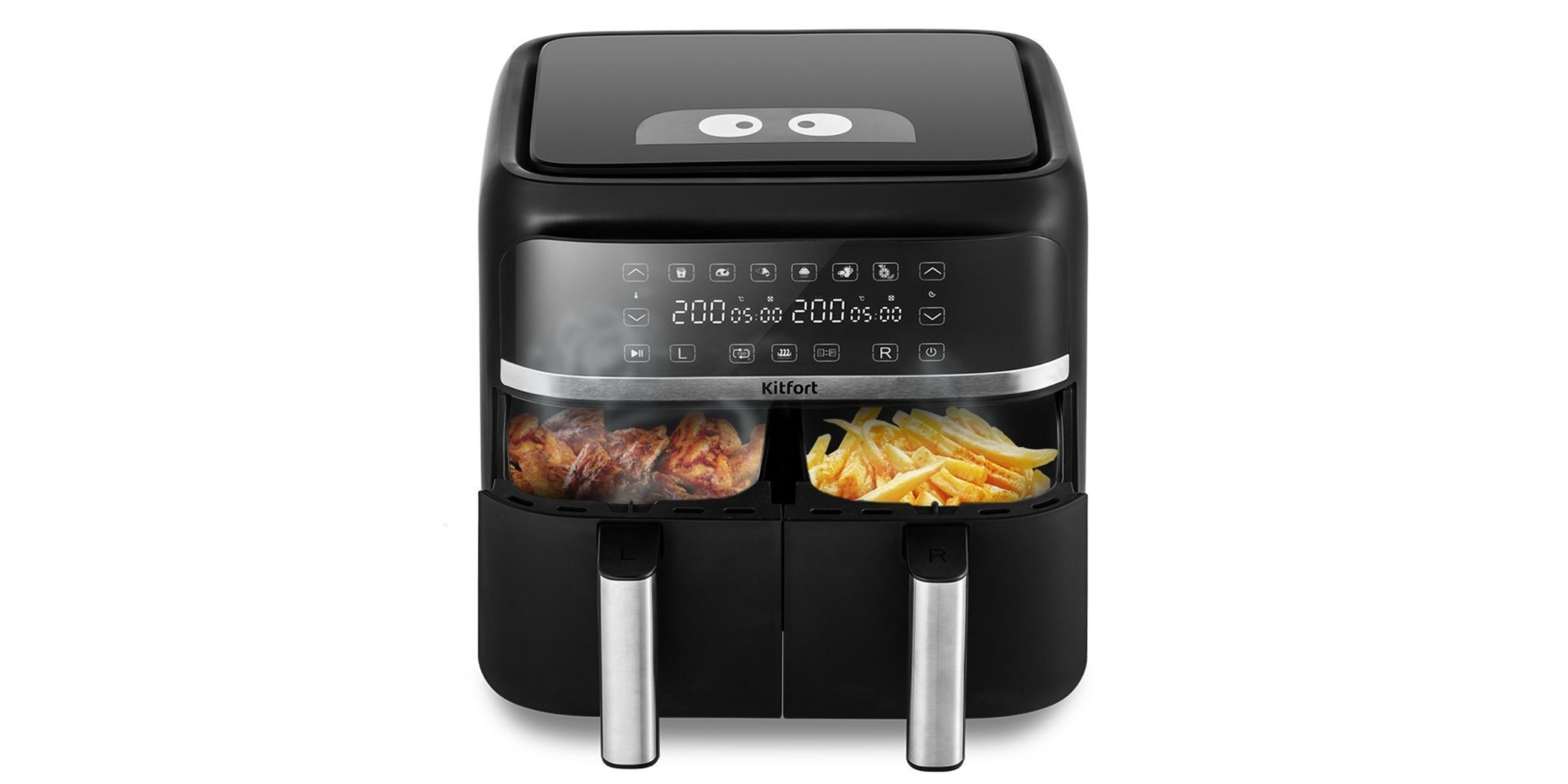 Характеристики: мощность 1450–1750 Вт на отсек, объём 2×4,5 л, 12 программ + ручные, регулировка 50–200 °C, таймер до 60 мин. Сенсорное управление, функция синхронизации приготовления и поддержания тепла.