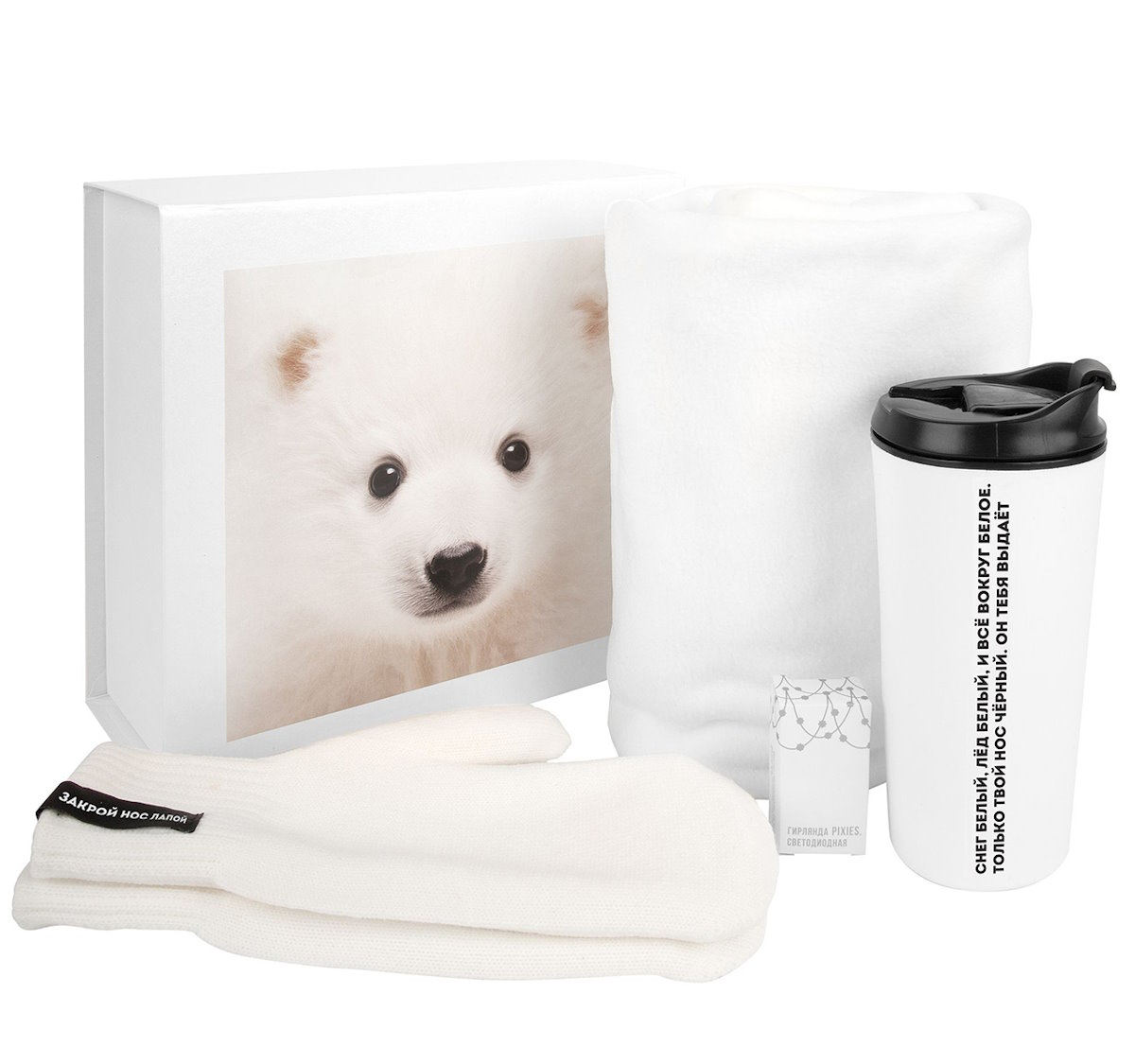 Белый, как сама зима, подарочный комплект, в составе которого – термостакан Edda с герметичной крышкой и черной гравировкой, светодиодная гирлянда Pixies, белоснежные варежки Life Explorer, флисовый мягкий плед Warm Peace. Набор упакован во вместительную коробку цвета первого снега, а на лицевой стороне расположена умилительная наклейка с изображением белого медвежонка. Будто сам Умка или его мама решили позаботиться о вашем хорошем настроении в новогодние праздники!