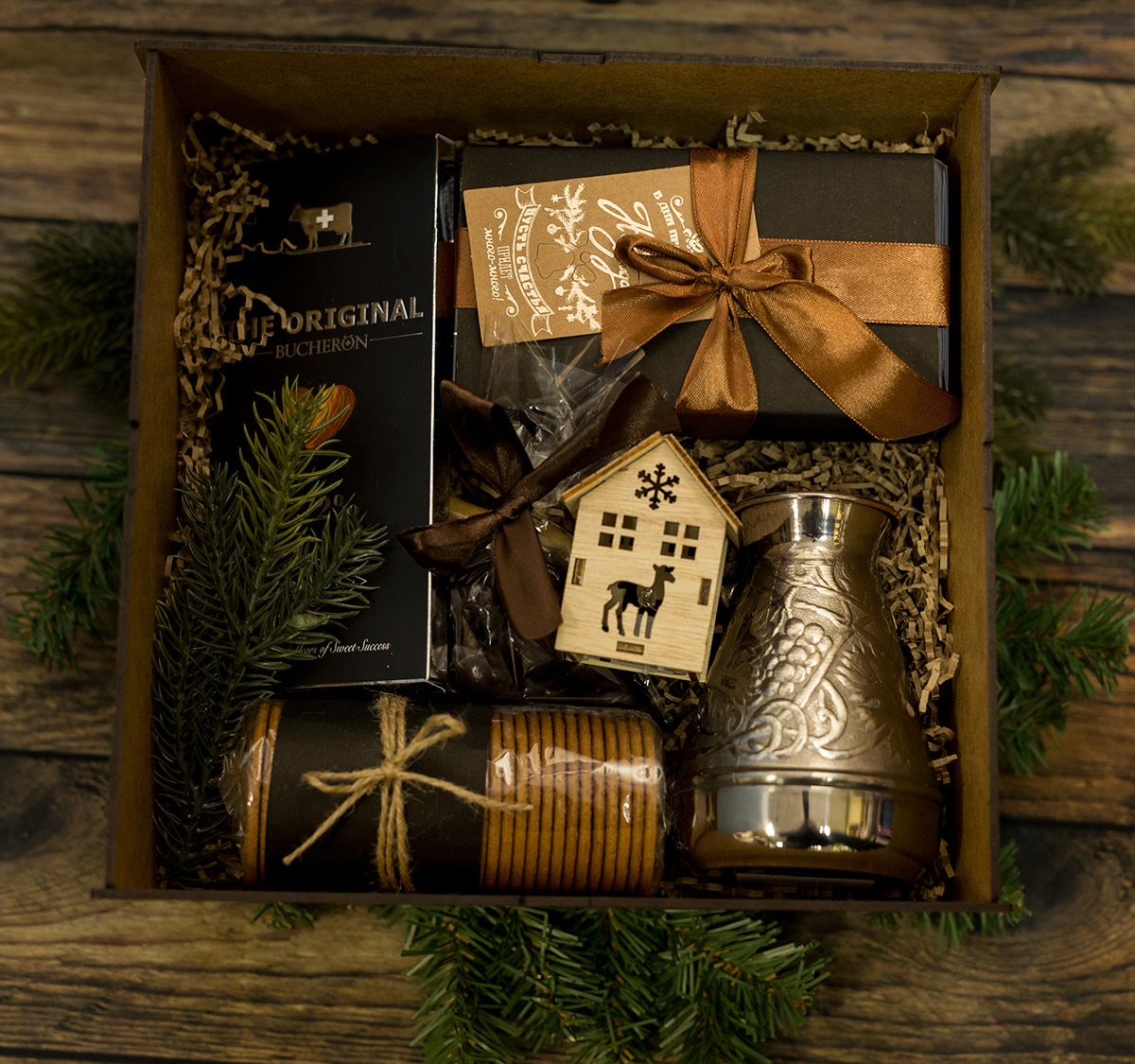 Вкусный и негрустный подарок, в состав которого входят турка для кофе, плитка шоколада, печенье, молотый кофе, орехи в темном шоколаде, небольшая открытка и деревянный игрушечный домик с нарисованным оленем! Этот подарок скрасит зимние обеденные перерывы и согреет темными вечерами. Будем надеяться, что коллега поделится с вами частью тех «вкусняшек», что вы ему вручите на корпоративе. Возможна доставка курьером по Москве, а также заказ подарка на сайте производителя.