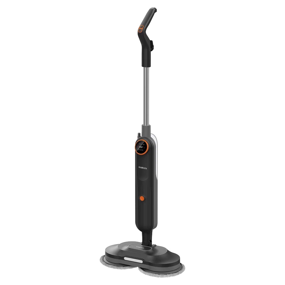Garlyn PM-2000 – паровая швабра, способная натирать пол до блеска благодаря оригинальной насадке. На ее подошве установлено две круглые вращающиеся платформы с салфетками, которые крутятся со скоростью до 250 об/мин. Такая конструкция механически оттирает загрязнения и полирует полы, подобно роботам-полотерам. При этом швабра подает горячий пар (мощность нагревателя 1500 Вт, давление до 3 бар) – то есть сочетает паровую и механическую уборку. Garlyn PM-2000 имеет 2 режима подачи пара (в том числе режим «сухой уборки» без лишней влаги) и подсветку зоны уборки для контроля чистоты. Емкость бака ~500 мл, нагрев воды занимает около 15 секунд. В комплекте 6 насадок: помимо основной вращающейся, есть стандартная насадка для пола, щетка, скребок и др.. Швабра достаточно массивная – вес около 4,4 кг, но оснащена функцией вертикальной парковки для удобного хранения.
