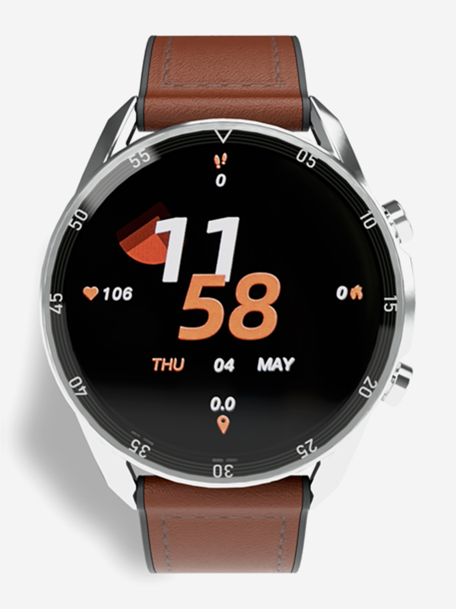 Корпус выполнен из титана, защищён сапфировым стеклом — выглядит солидно и чувствуется надёжно. Часы доступны с титановым браслетом или классическим кожаным ремешком. Дисплей 1,5 дюйма, AMOLED, яркий, контрастный, с хорошей читаемостью даже под солнцем. Управление через две кнопки, одна из которых — вращающаяся, что упрощает навигацию.