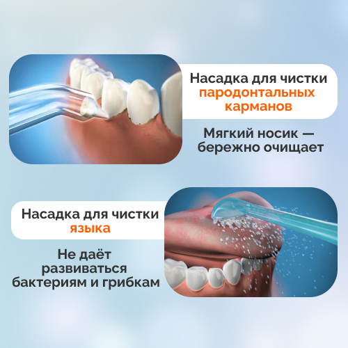 Неочевидное и важное Во рту около 500 видов бактерий и грибков, которые могут вызывать болезни полости рта, приводить к проблемам с ЖКТ и сердечно-сосудистой системой. Ирригатор выбивает микроскопические остатки пищи, скапливающиеся на языке и между зубов. Предотвращает развитие инфекций. Приятный запах изо рта даже после сна.