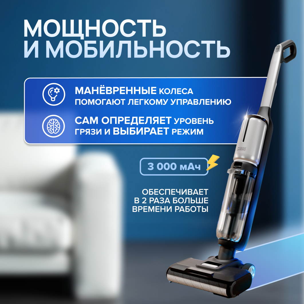Сила вне конкуренции Высокая мощность всасывания 15 000 Па — эффективно всасывает пыль и крупные загрязнения.