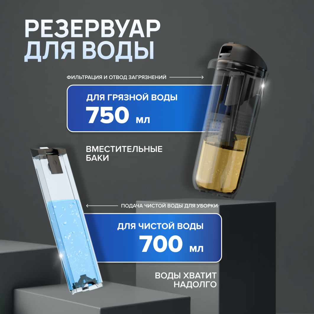 Воды хватит надолго Вместительные баки для грязной (750 мл) и чистой воды (700 мл) рассчитаны на уборку частного дома.