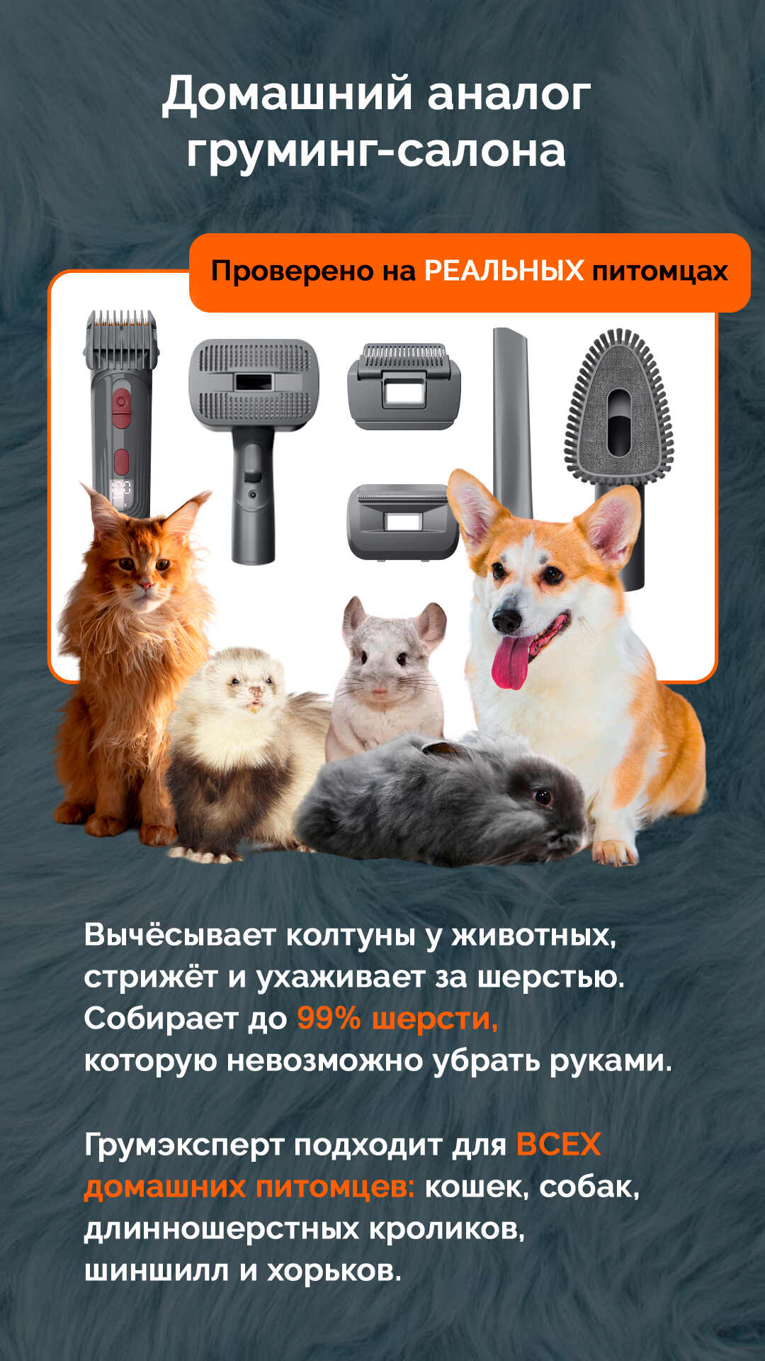 Вычёсывает, стрижёт + всасывает 99% шерсти!