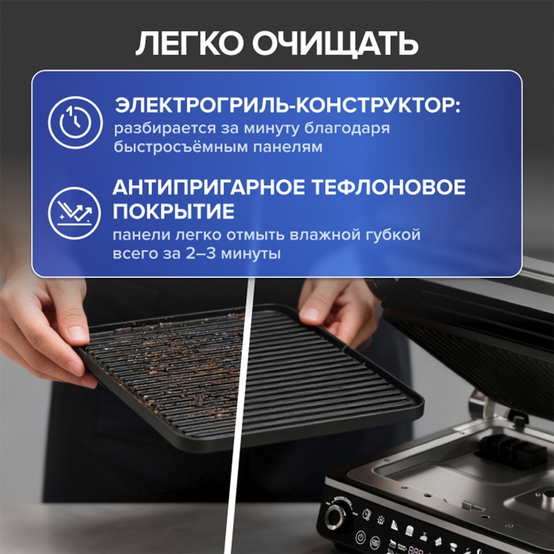 Лёгкая очистка Электрогриль-конструктор: разбирается за минуту благодаря быстросъёмным панелям. Антипригарное тефлоновое покрытие не вступает в реакцию с продуктами, моющим средством, водой и буквально отталкивает жир, поэтому панели легко отмыть влажной губкой всего за 2–3 минуты.