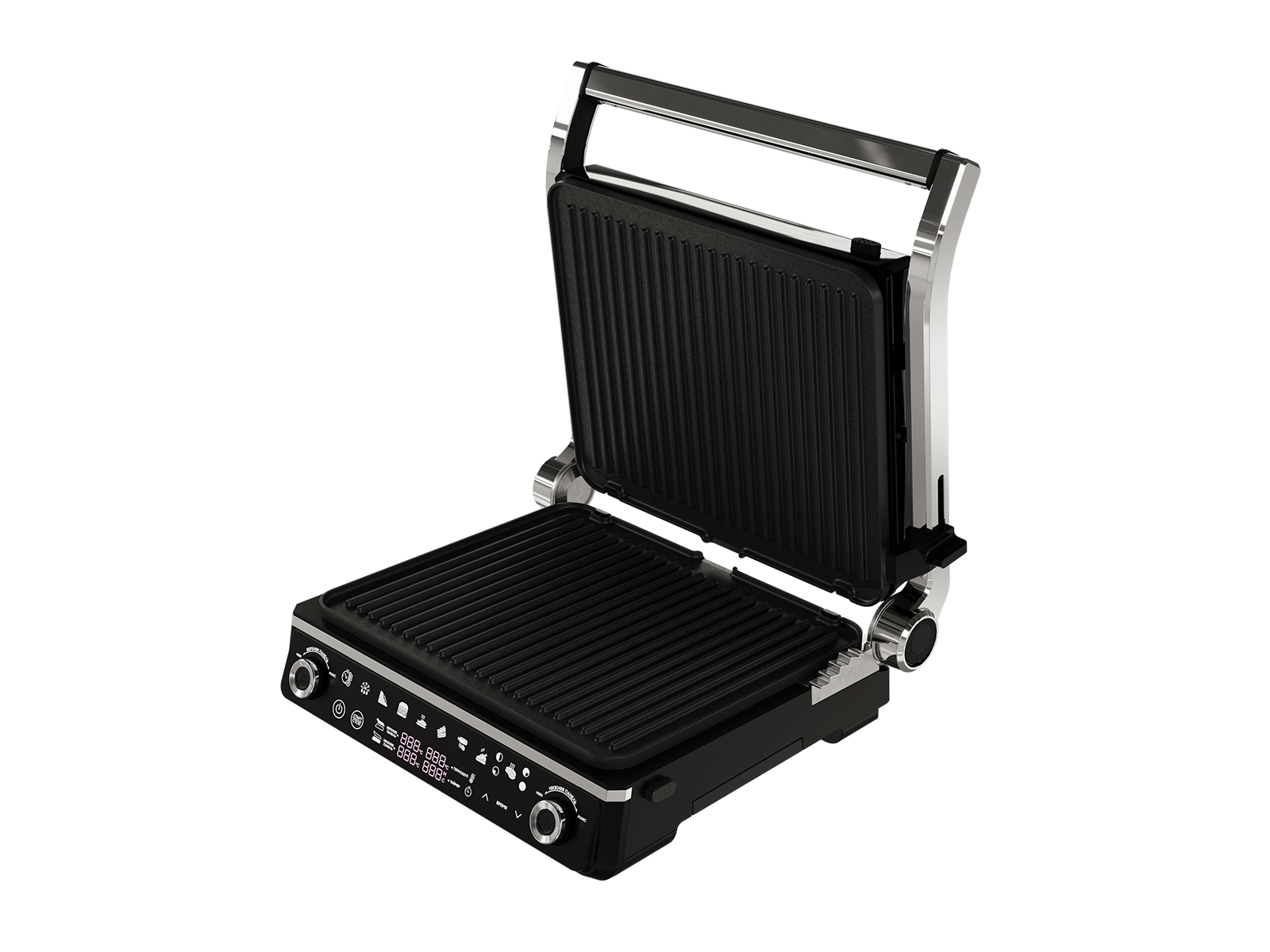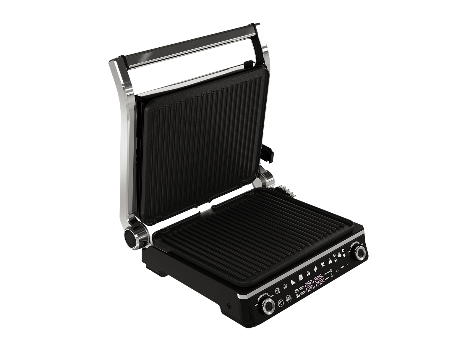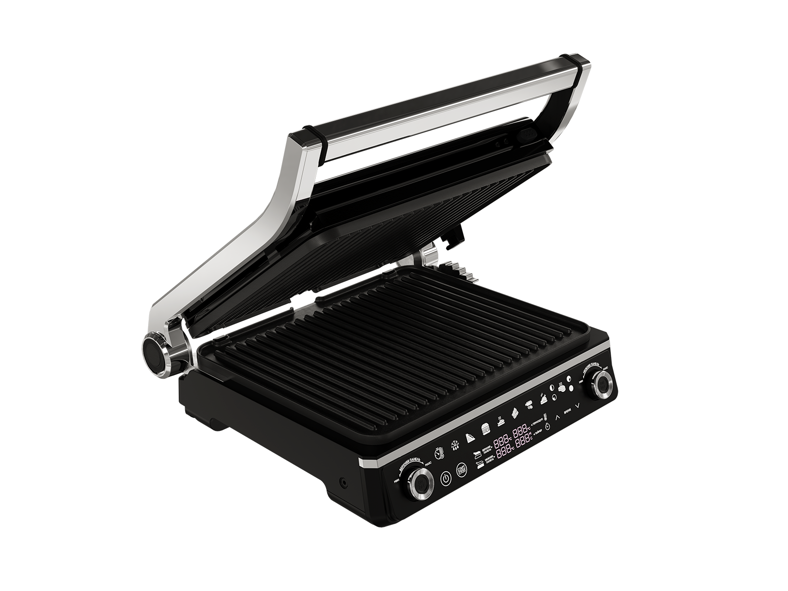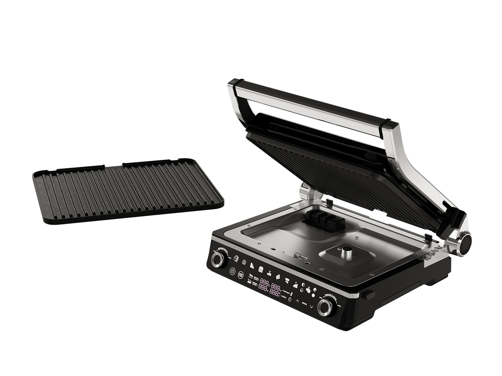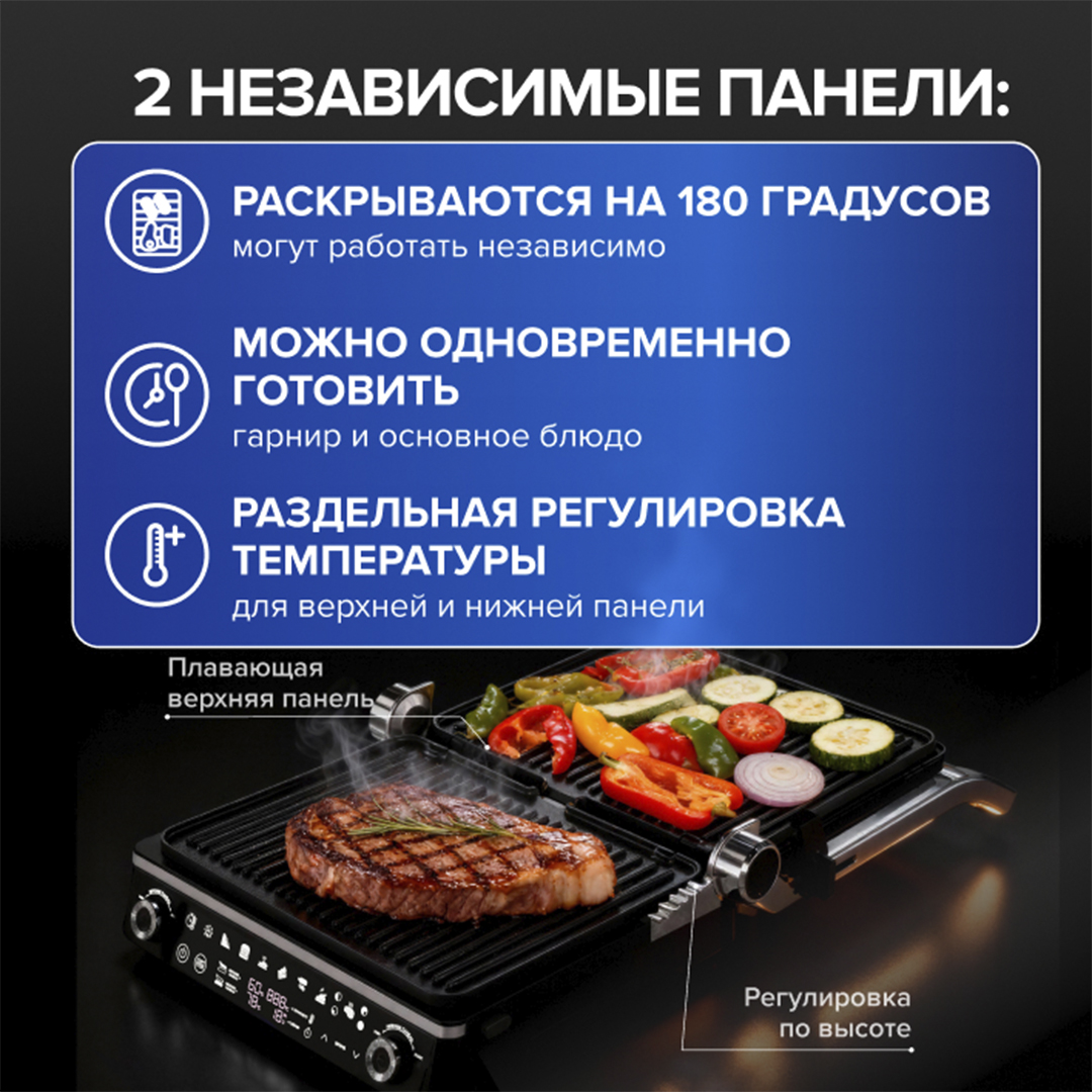 2 независимые панели Можно одновременно готовить гарнир и основное блюдо. Плавающая верхняя панель и регулировка по высоте дает возможность использовать гриль как духовку, обеспечивая эффект запекания.