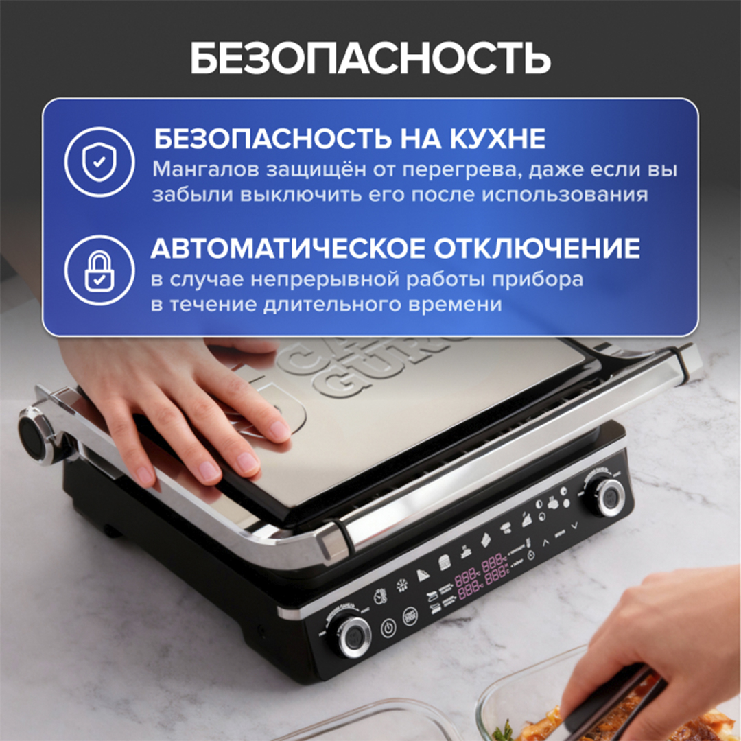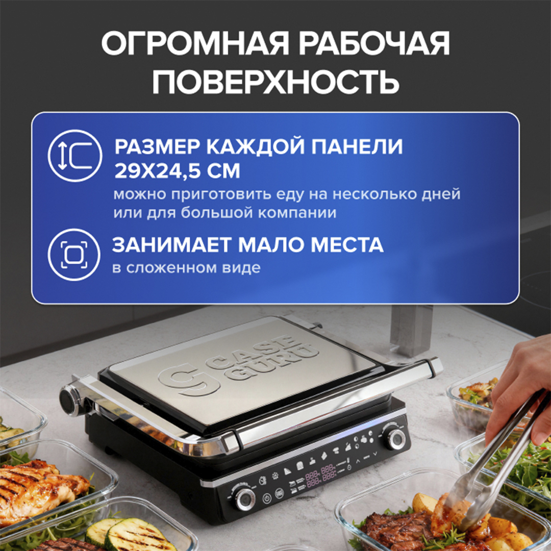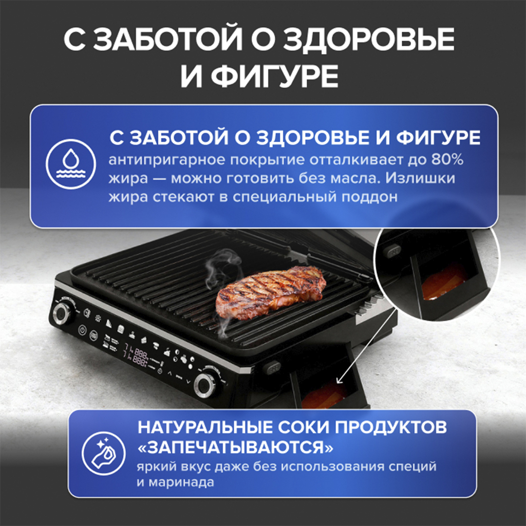 Приготовит что угодно Готовит любые продукты — от сочных стейков, птицы и нежных морепродуктов до хрустящих овощей и тостов. Позволяет готовить еду как на мангале, но без дыма, сажи и привязки к погодным условиям.