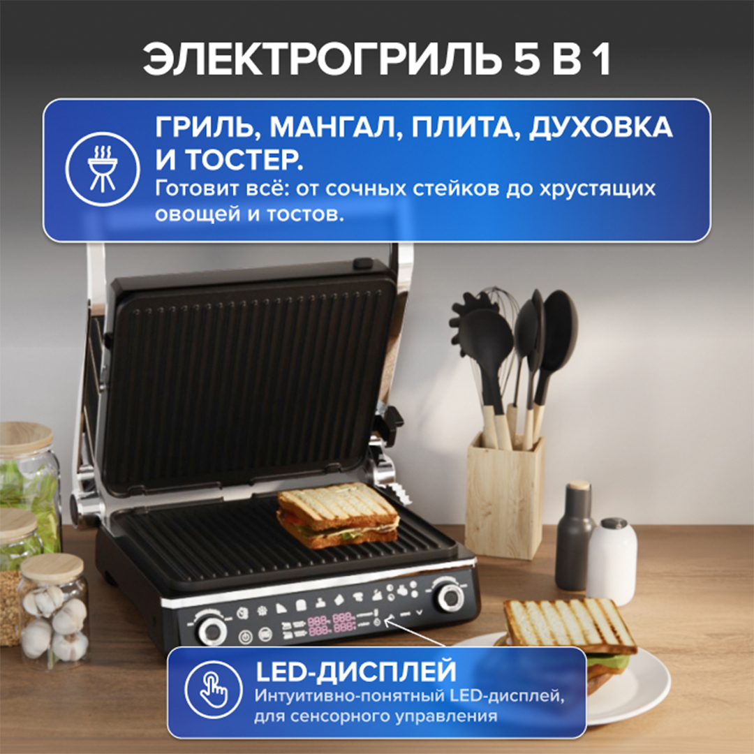 Электрогриль 5 в 1 Выполняет функционал 5 устройств для кухни: гриль, мангал, плита, духовка и тостер.