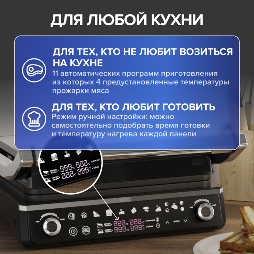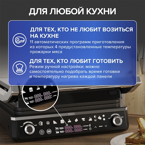 Для тех, кто не любит возиться на кухне 11 автоматических программ приготовления, из которых 4 — предустановленные степени прожарки мяса, основанные на рецептах поваров из ресторанов Мишлен.