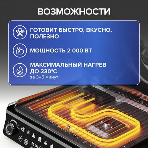 Благодаря огромной мощности в 2 000 Вт и нагреву до 230°C всего за 3–5 минут, можно приготовить еду максимально быстро.