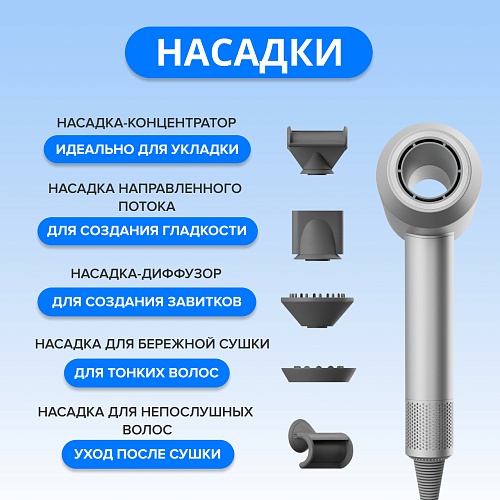Для множественных укладок Сушит волосы на уровне фенов, которыми парикмахеры укладывают волосы в салоне красоты. Подходит для всех типов волос: прямых, вьющихся, кудрявых, окрашенных.