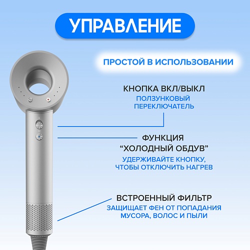 Эффект мультистайлера 4 температурных режима + 3 скорости воздушного потока. Можно уложить волосы с помощью высокой температуры или быстро просушить локоны — на средней. Подстраивайте фен под индивидуальные потребности!
