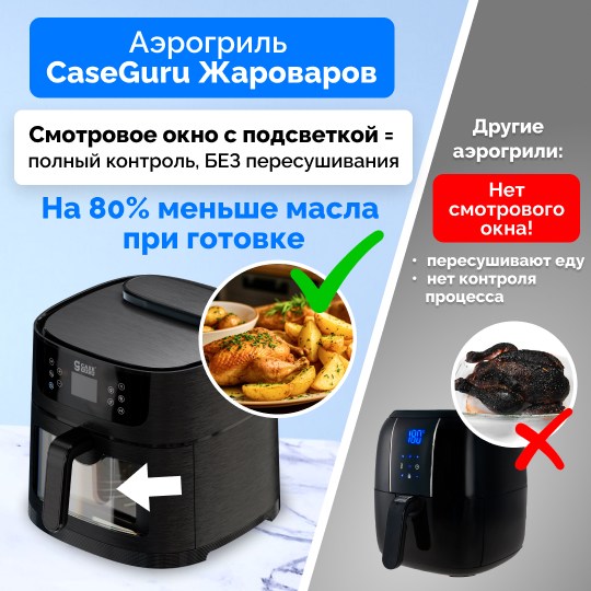 Гуру полезного питания При готовке нужно на 80% меньше масла, чем при жарке на сковороде и в других аэрогрилях. Натуральный вкус продуктов. Полезные компоненты не «выжариваются» из еды, как при готовке на сковороде и в дешёвых аэрогрилях.