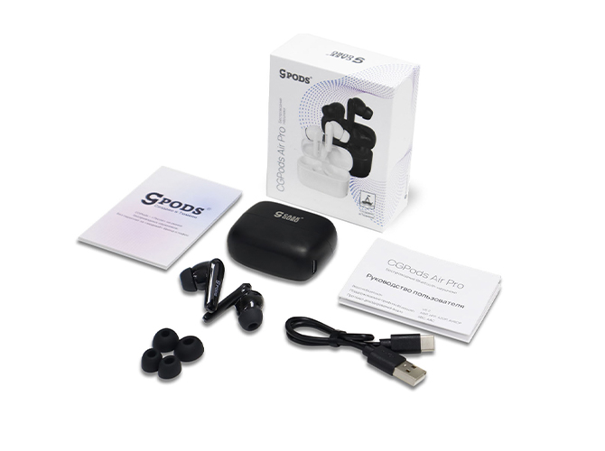 Беспроводные наушники CGPods Air Pro, кейс для зарядки и хранения наушников, сменные амбушюры, USB/Type-C кабель для зарядки.
