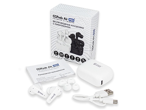 Беспроводные наушники CGPods Air Pro, кейс для зарядки и хранения наушников, сменные амбушюры, USB/Type-C кабель для зарядки.