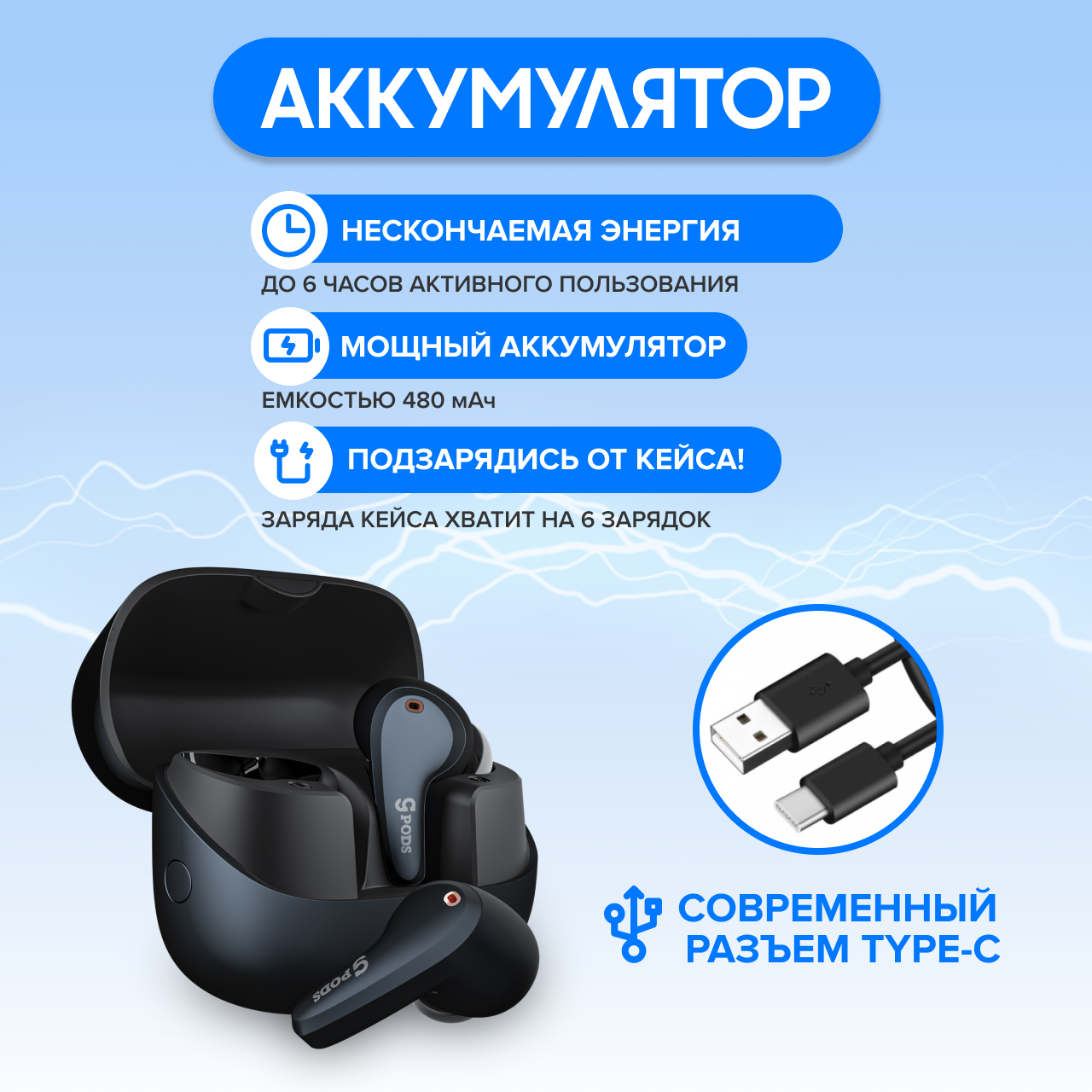 Нескончаемая энергия вашей музыки До 6 часов активного пользования и до 70 часов заряда кейса.