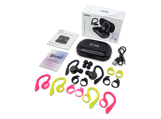 Беспроводные наушники CGPods Sport, кейс для хранения и зарядки, силиконовые крепления за ухо (3 пары: черные, розовые, зеленые), силиконовые крепления в ушную раковину (4 пары: черные L, черные S, розовые L, зеленые L), кабель Type-C для зарядки, инструкция / гарантийный талон.