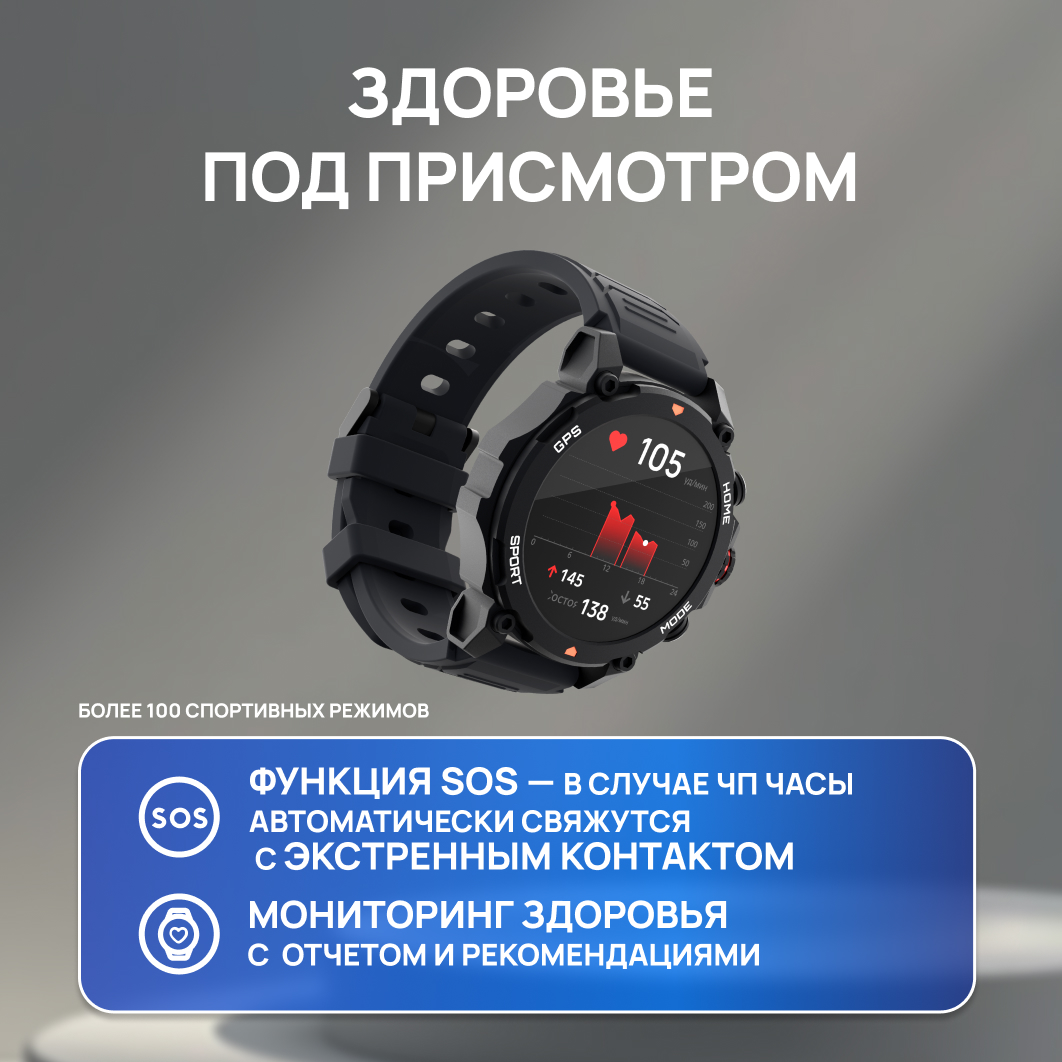 Всегда в безопасности Функция SOS для вашего спокойствия. Возможность добавить экстренный контакт в приложение или прямо на часах — в случае ЧП часы автоматически свяжутся с ним.